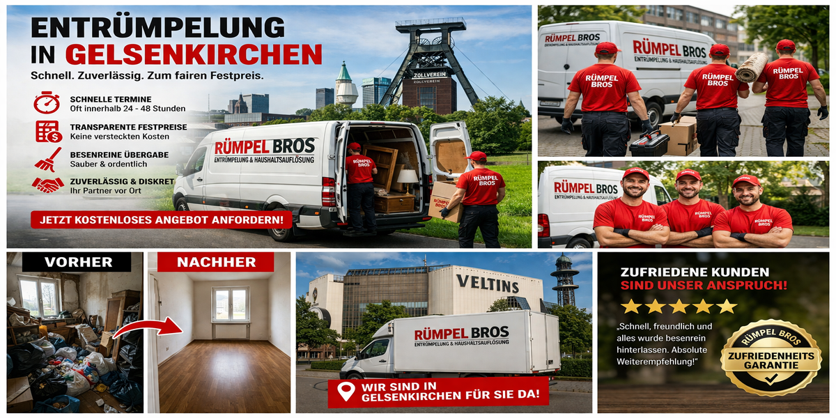 Rümpel Bro’s Gelsenkirchen ist ein familiengeführtes Unternehmen mit langjähriger Erfahrung in der Entrümpelungsbranche. Wir stehen für Zuverlässigkeit, Professionalität und Kundenzufriedenheit.